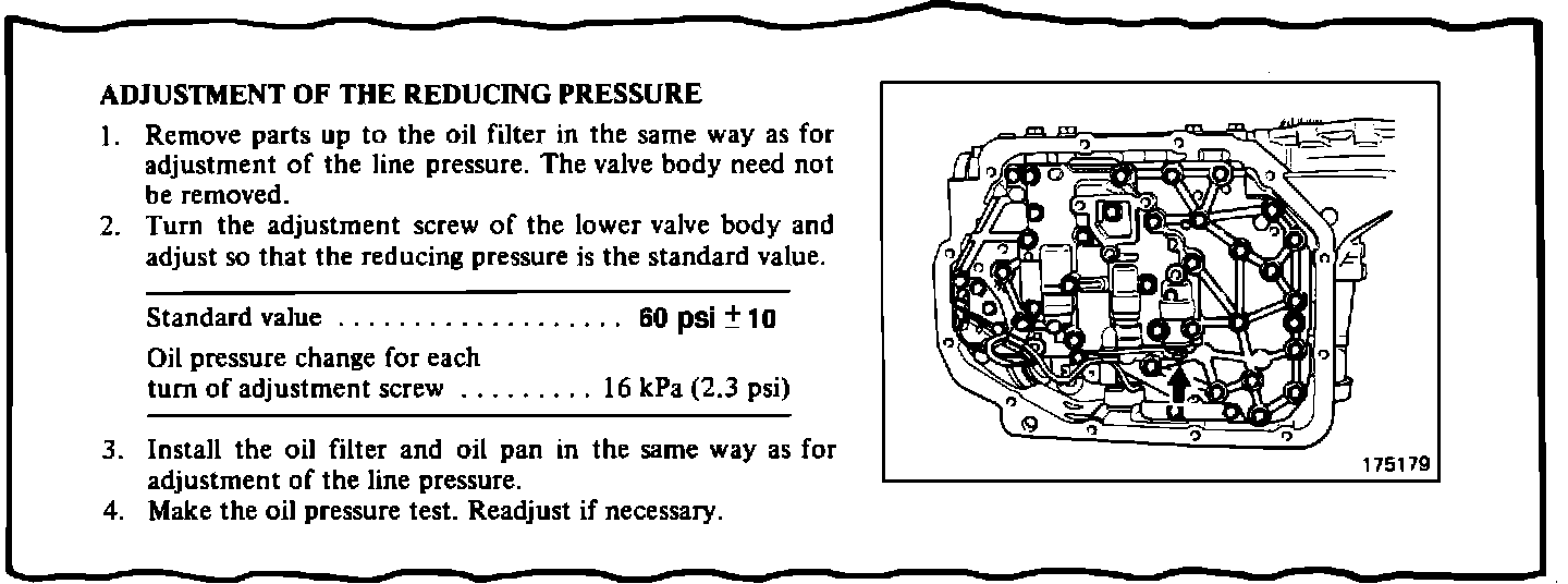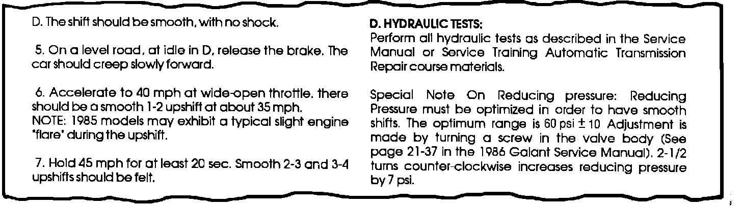 This bulletin corrects an error in the 1986 Galant Service Manual. The automatic transmission reducing pressure specification has been changed. As reference to this bulletin, please write the STB number in the revision box on Page 21-37.