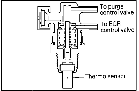 The thermo valve, Fig. 25 senses engine coolant temperature at the intake manifold. When the engine coolant temperature is lower than the pre-set value the thermo valve holds the purge control valve closed to reduce CO and HC emissions during warm-up. Once the engine warms up the thermo valve allows the purge control valve to open.