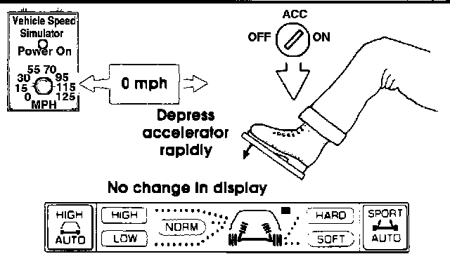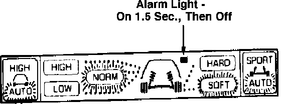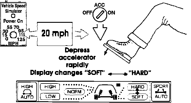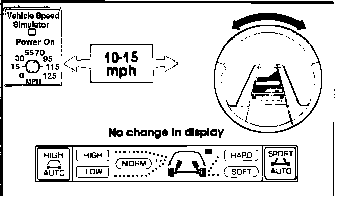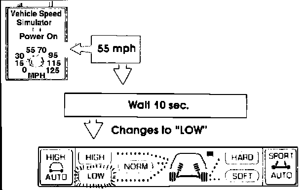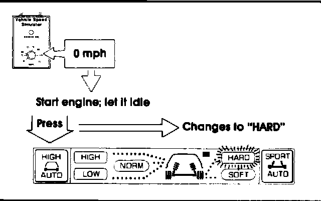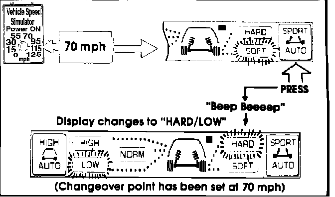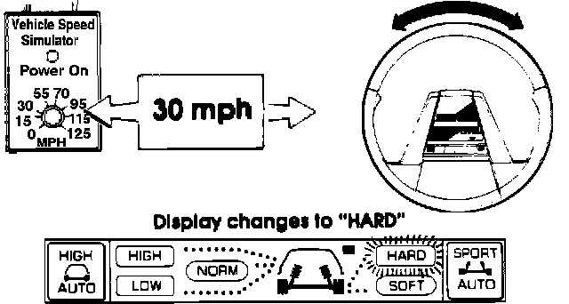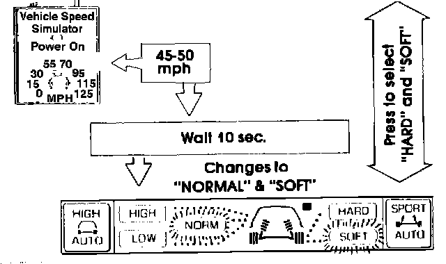 1. Set the knob on the Simulator to 70 mph. Observe the control panel display. The suspension firmness indicator should show "SOFT". Now press the "SPORT AUTO" button and hold. There should be a short beep followed by a long beep, and the display should change to "HARD/LOW. If the system is operating properly, the changeover point to "HARD/ LOW' has been set at 70 mph. See Fig 7.