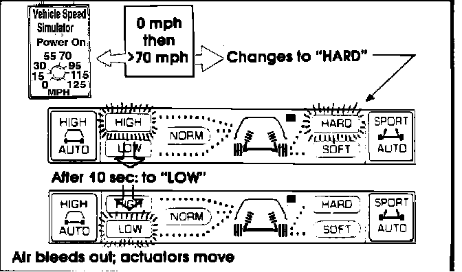 2. Return the speed knob to 0, and then set it at some setting above 70 mph. Observe that the firmness display changes immediately to "HARD" and after ten seconds the height changes to "LOW". Fig.8. Listen for the sound of air bleeding from the system; watch the strut actuators as the height changes. These indicate normal operation.
