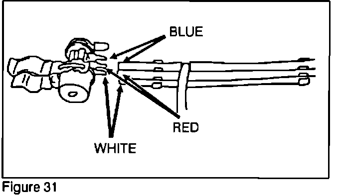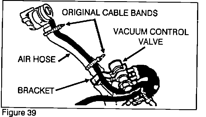 b. Connect to this port, the (Red, then White Striped) vacuum hose. This vacuum hose (Red, then White Striped) is connected to the middle port of the Vacuum Control Valve at one end and has an open "TEE" port in the line (Figures 32 and 38).