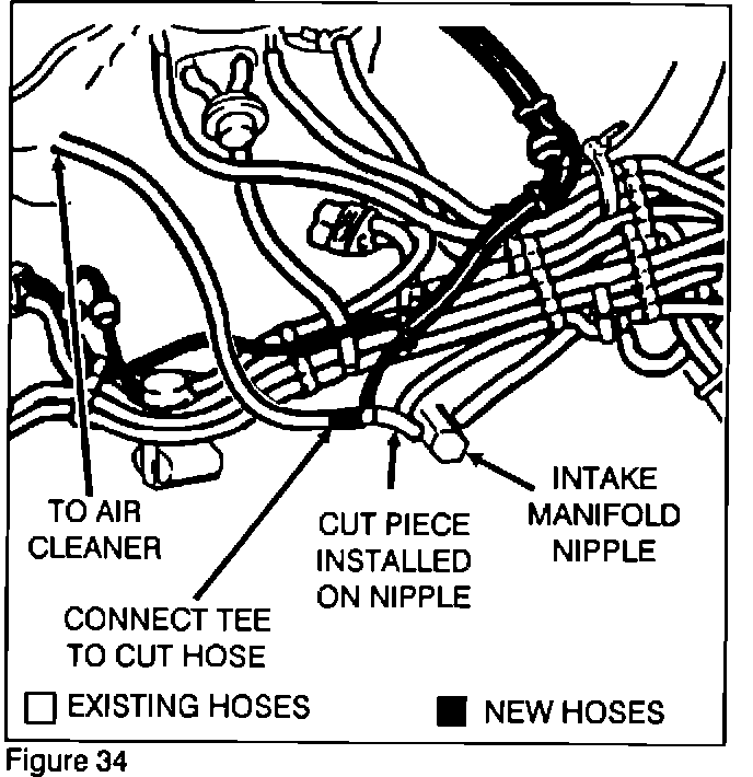 3. Remove the green striped vacuum hose between the Thermo Valve and the EGR Valve (Figure 33). Install the new vacuum hose assembly (Figure 32) from the emissions kit between the Thermo-Valve and the EGR valve.