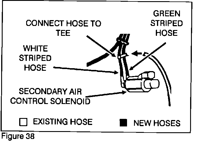 c. Connect to the open "TEE" port mentioned in step 7-b, the vacuum hose (White Striped) that was removed from the Secondary Air Control Solenoid Valve in Step 7-a (Figures 38 and 32).