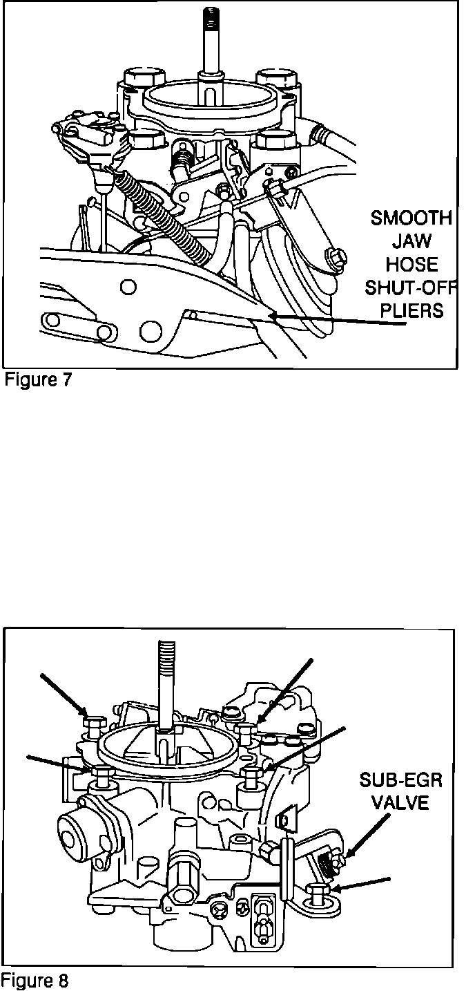3. To prevent excessive coolant leakage use smooth jaw hose shut-off pliers to pinch off the coolant hose from the intake manifold to the choke thermo wax housing. Then twist and disconnect the hose from the carburetor.