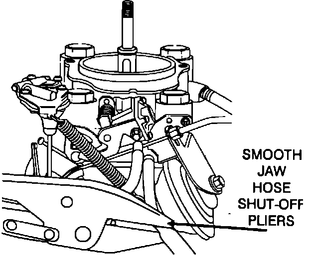 3. To prevent excessive coolant leakage use smooth jaw hose shut-off pliers to pinch off the coolant hose from the intake manifold to the choke thermo wax housing (Figure 6). Then twist and disconnect the hose from the carburetor.