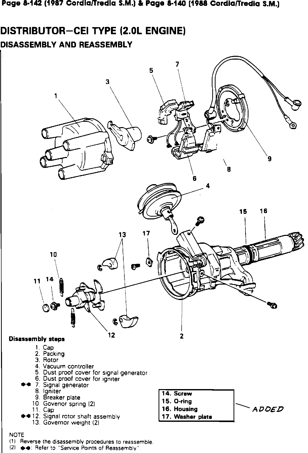 This bulletin contains revised distributor assembly and adjustment procedures for 1987-1988 Truck and 1986-1988 Cordia/Tredia vehicles.