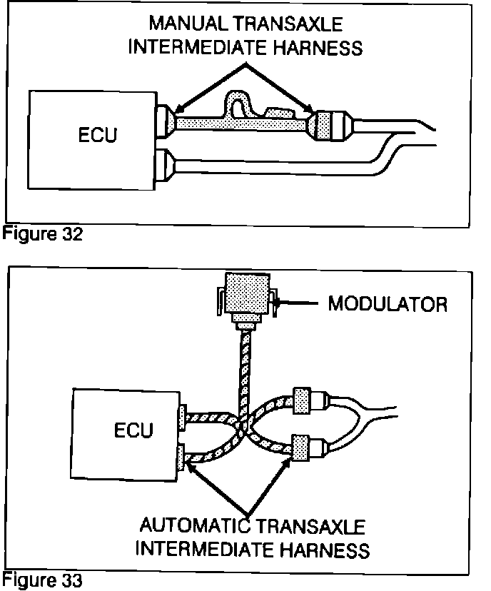 4. Check for the installation of the intermediate harness connected to the Electronic Control Unit (Figure 32 for Manual Transaxles, Figure 33 for Automatic Transaxles).