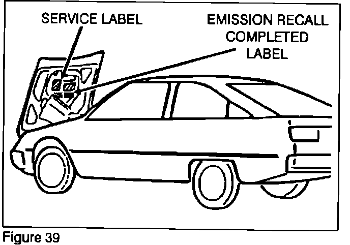 3. Carefully remove all dirt and oil from the area below the lower right side of the existing Service Label. Affix the Emission Recall Completed Label along the RIGHT side of the EMR-90-009 Emission Recall Completed Label (Figure 39).