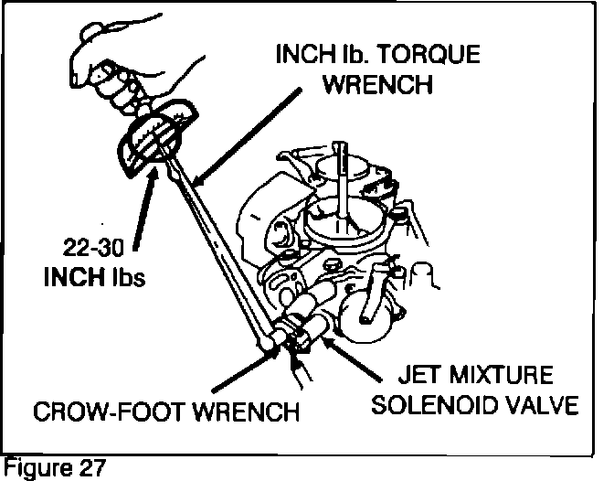 6. Using the INCH lb. torque wrench and a 13 mm crow-foot wrench (Figure 27), torque the Jet Mixture Solenoid Valve to 22-30 INCH lbs.