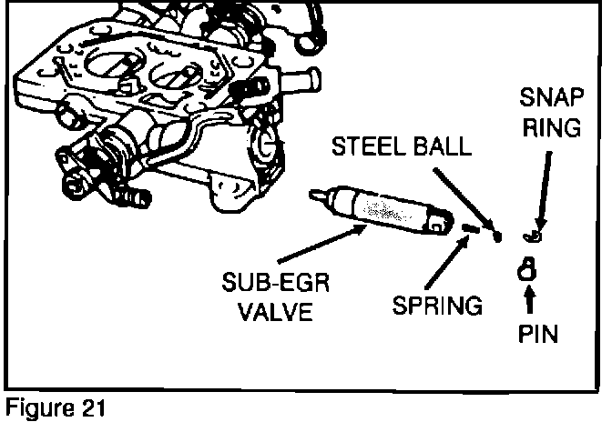 If the Sub-EGR valve will not come out of the carburetor, remove the snap ring from the Sub-EGR valve pin (Figure 21). Then carefully remove the pin and the link, taking care not to lose the spring and steel ball from the valve. Insert a small phillips screwdriver in the pin hole for use as a handle. To loosen the carbon deposits, spray carburetor cleaner into the Sub-EGR Valve passages. Then, remove the valve from the carburetor.