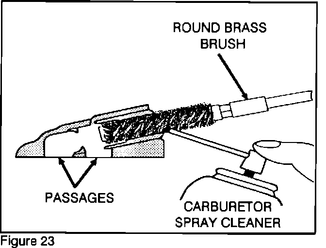 4. Spray carburetor cleaner into the Sub-EGR valve bore. Insert a round brass brush into the Sub-EGR valve bore and clean the plunger hole (Figure 23). Use the round brass brush to clean the underside valve passages.