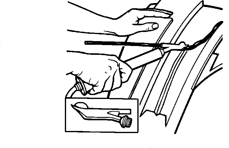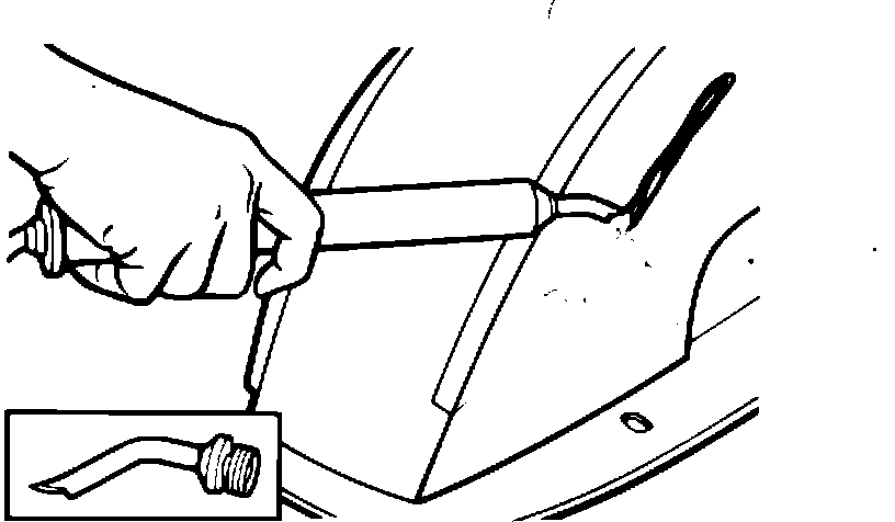 ^ Singe the repair area with a torch to further improve adhesion. Caution should be used so that the surface is not burned. If a hole or puncture is being repaired, apply tape to the underside of the repair area. Using a rubber squeegee, apply a light coat of structural adhesive to the repair area and allow to cure for 30 minutes.
