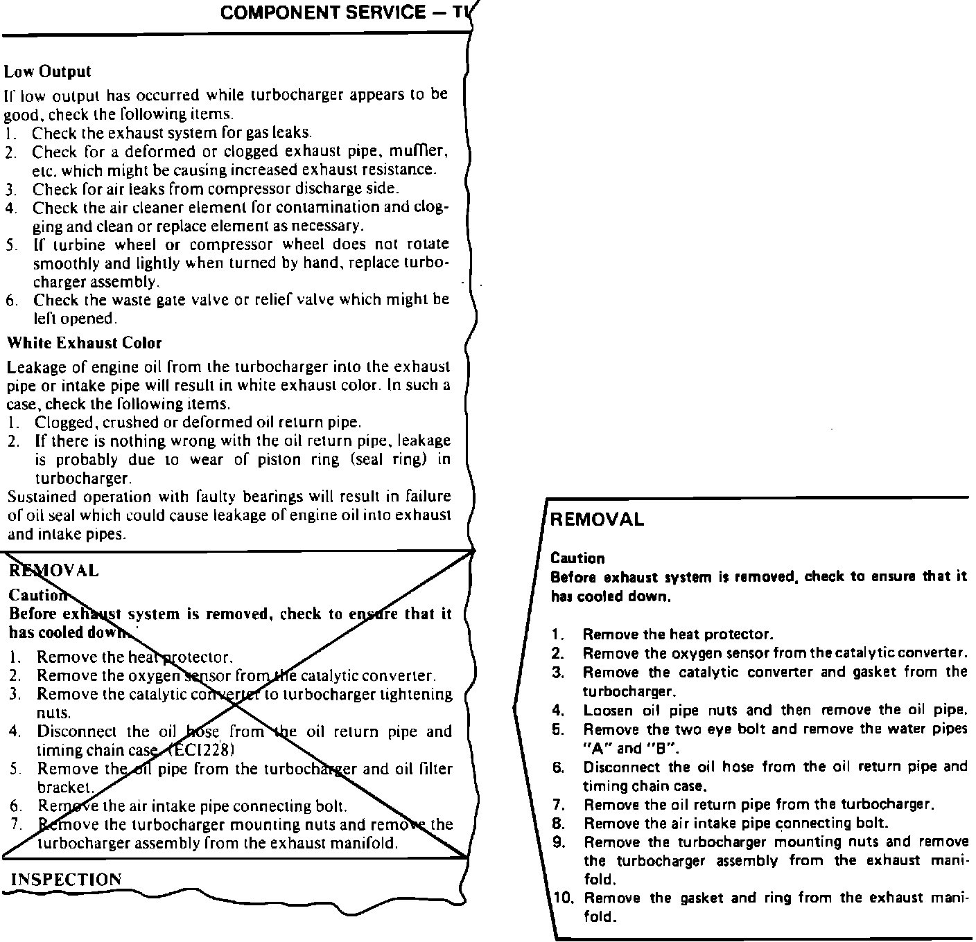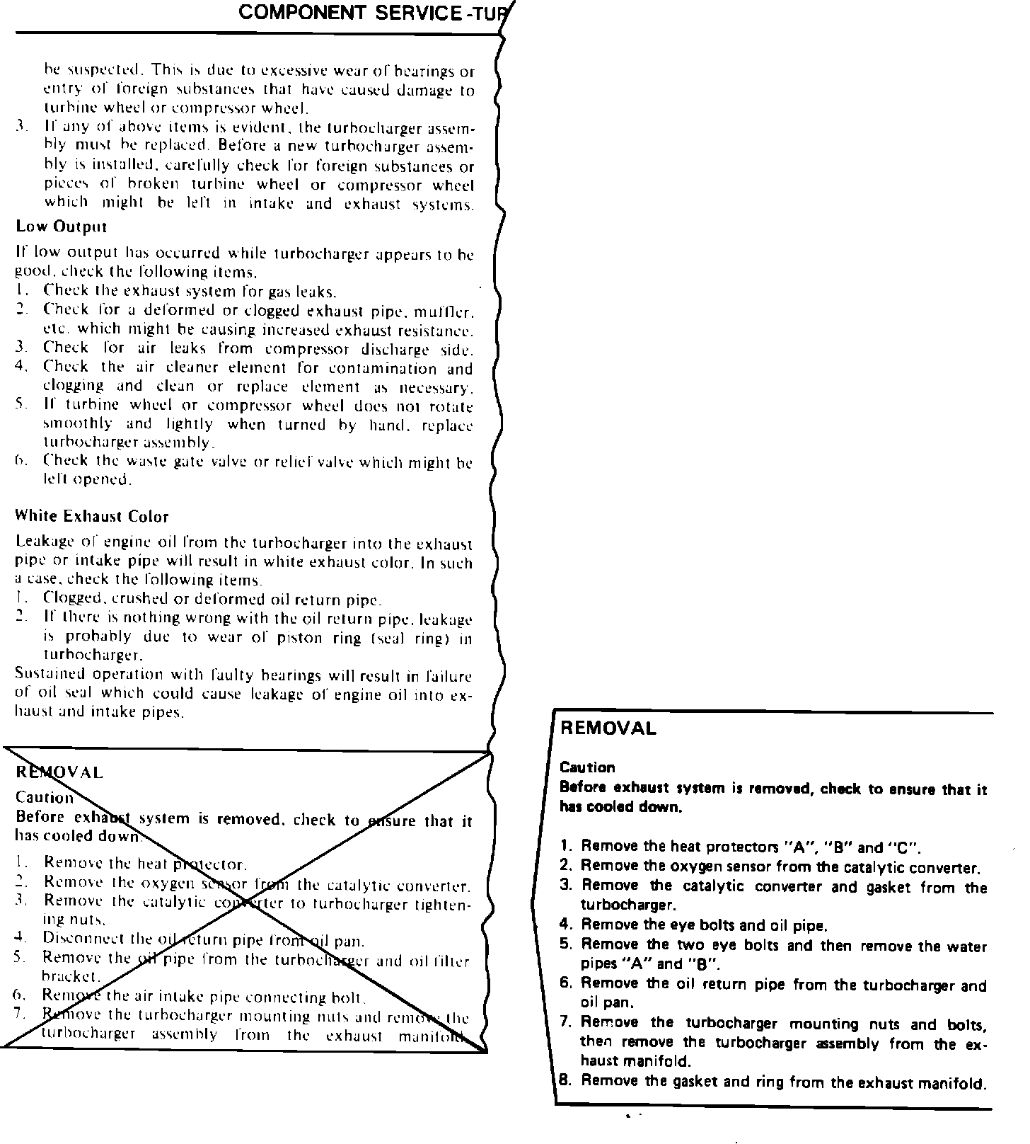 1986 CORDIA/TREDIA SERVICE MANUAL PAGE 9-67 COMPONENT SERVICE - TURBOCHARGER Replace the "Removal" steps as illustrated.