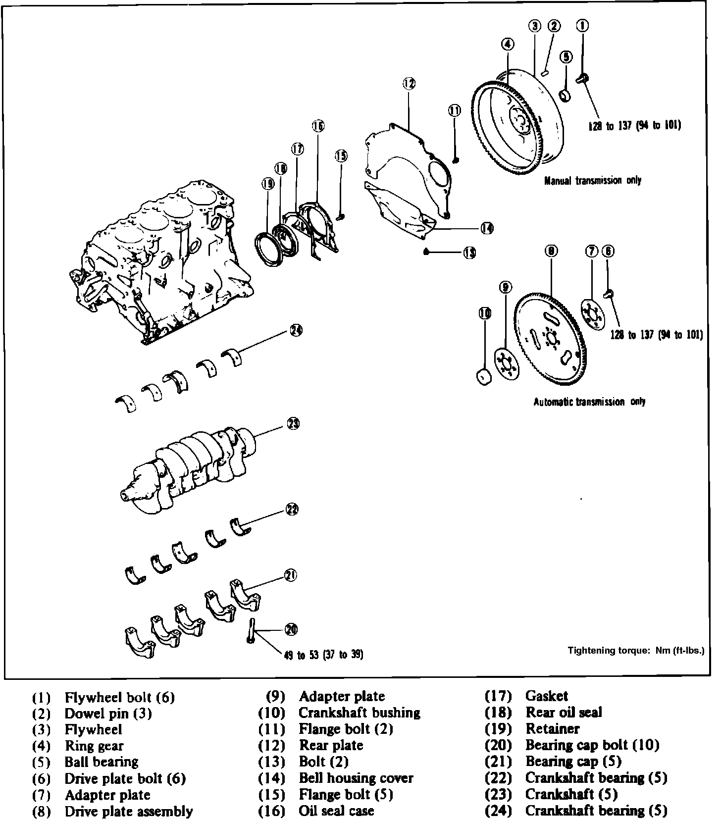 10. On automatic transmission models, install adapter plates and drive plate, then torque bolts to specification.