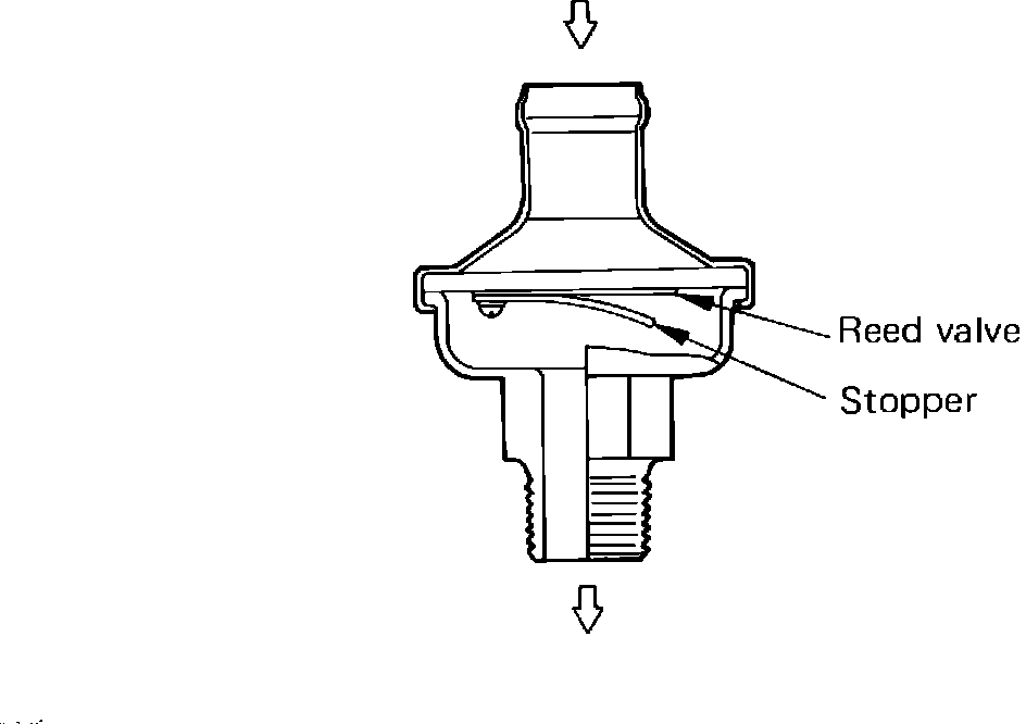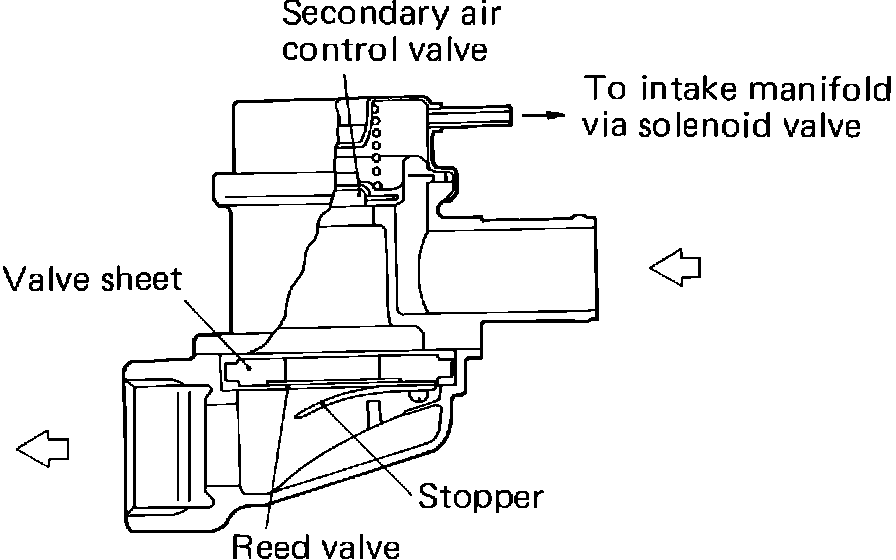 A second reed valve, Fig. 87 supplies additional air into the exhaust pipe upstream of the rear catalytic converter while the engine is running. Exhaust vacuum generated from pulsations in exhaust manifold pressure actuate the reed valve to supply secondary air to reduce exhaust emissions.