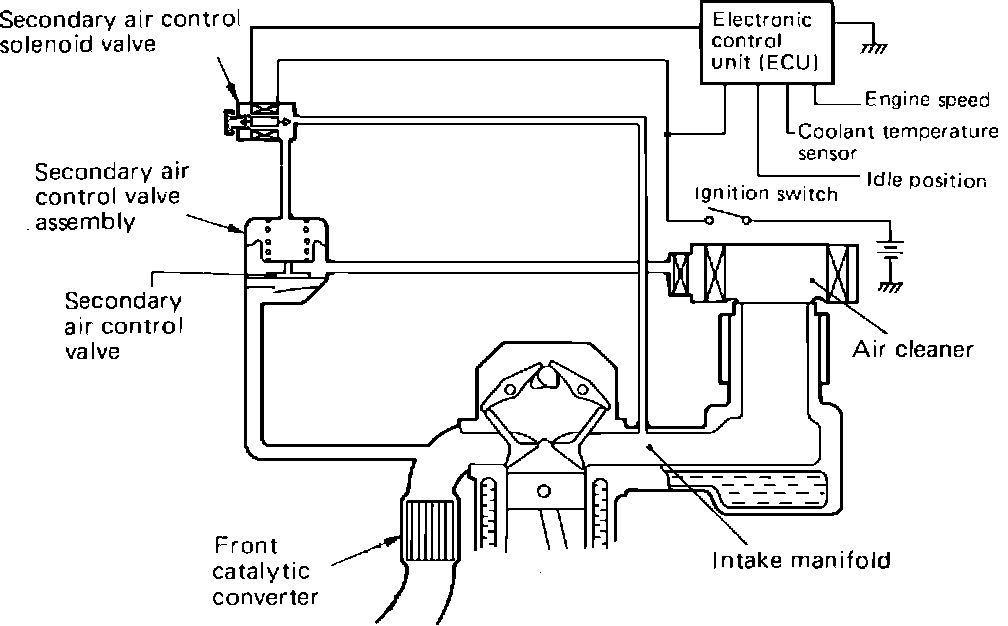The secondary air control valve is opened by intake manifold vacuum when the solenoid valve is energized by the ECU based on the information on coolant temperature, engine speed, time, and idle position switch status.