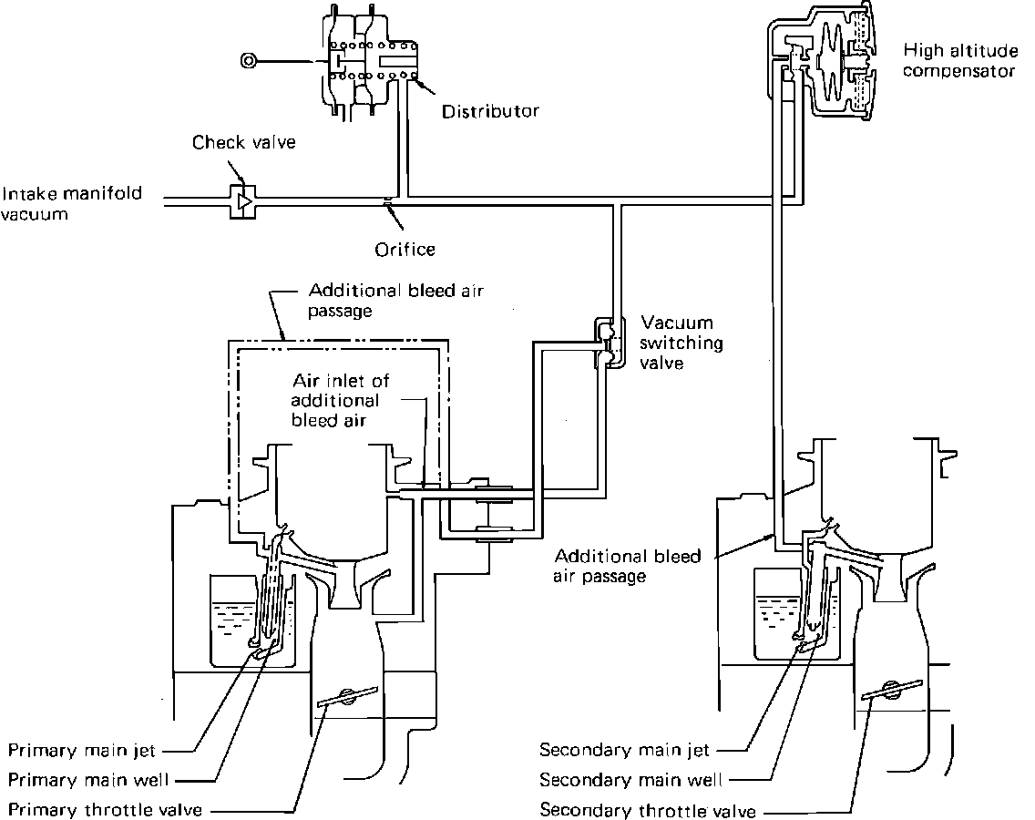 * At high altitude the HAC closes the air-leak line and vacuum signal is sent to the vacuum switching valve. The vacuum switching valve then opens an additional air bleed to the primary main well. In addition the HAC also opens the additional bleed air passage to secondary main well.
