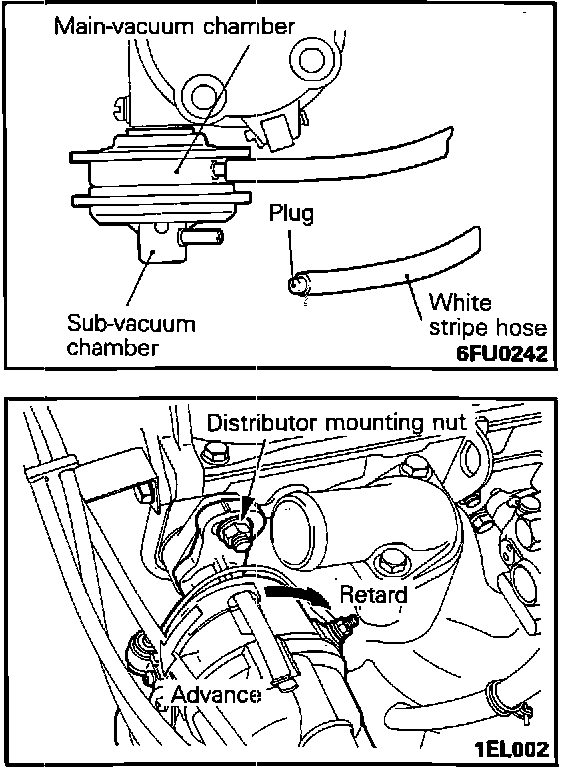 2. At high altitude (over 3900 ft / 1200 m), disconnect and plug white-stripe hose from distributor sub-vacuum chamber.