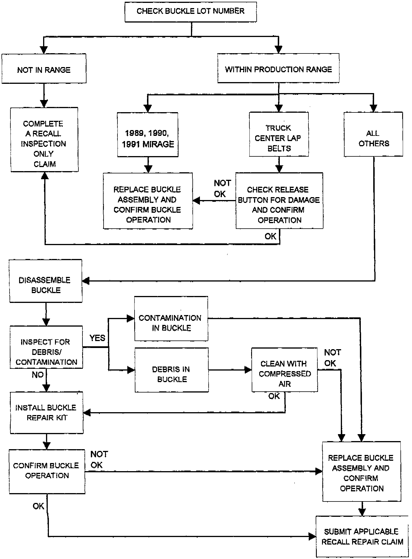 On 1989, 1990 and 1991 Mirages, the front seat lap belt buckle assemblies must always be replaced. On other affected vehicles, front seat belt buckles produced before January 1991 must be disassembled and a Buckle Repair Kit containing a new release button must be installed on both front seat buckles. The lot number on the buckle indicates the production date.