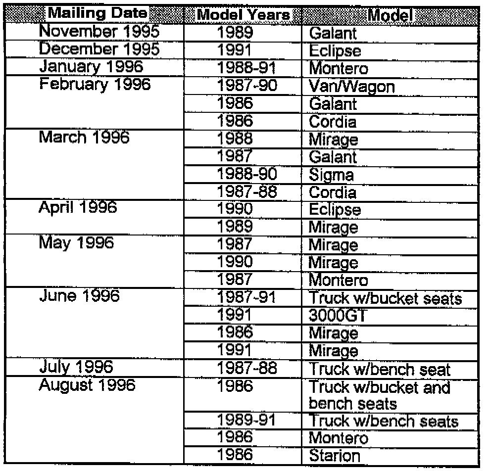 A letter is being sent to all affected vehicle owners over a ten month period telling them to return their vehicles to their Mitsubishi Motors dealer to have their front seat belt buckles repaired or replaced at no charge to the customer. A copy of this letter is shown in this bulletin. Customer notification will be mailed according to the following schedule. Parts availability is based on this notification schedule.