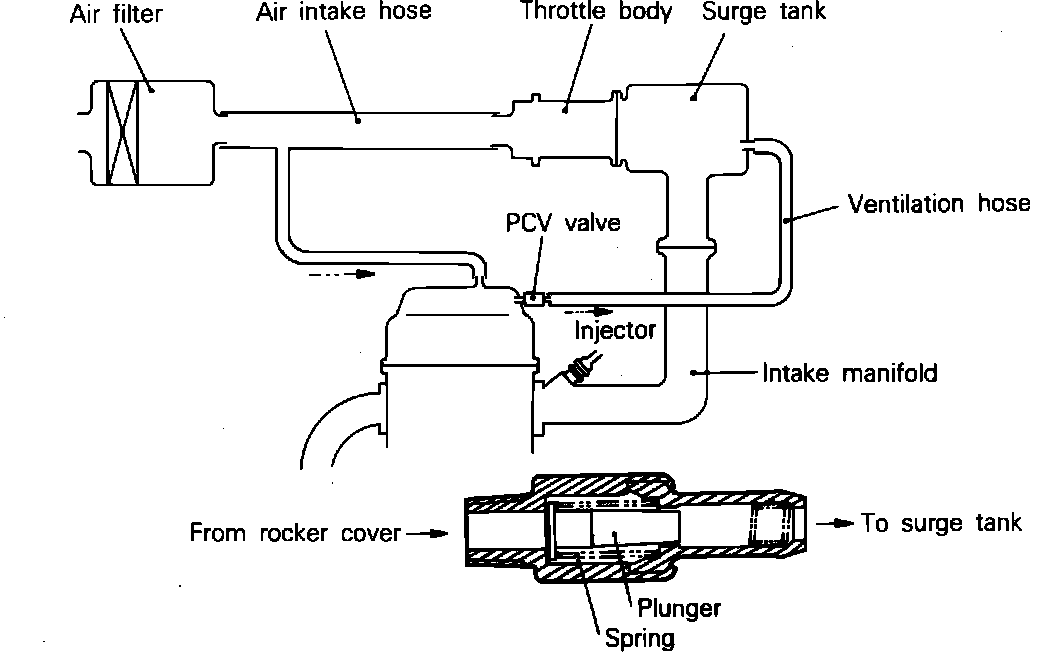 Fresh air is supplied to the crankcase through the air cleaner. Inside the crankcase fresh air is mixed with blow-by gases and this mixture passes through the PCV valve into the induction system.