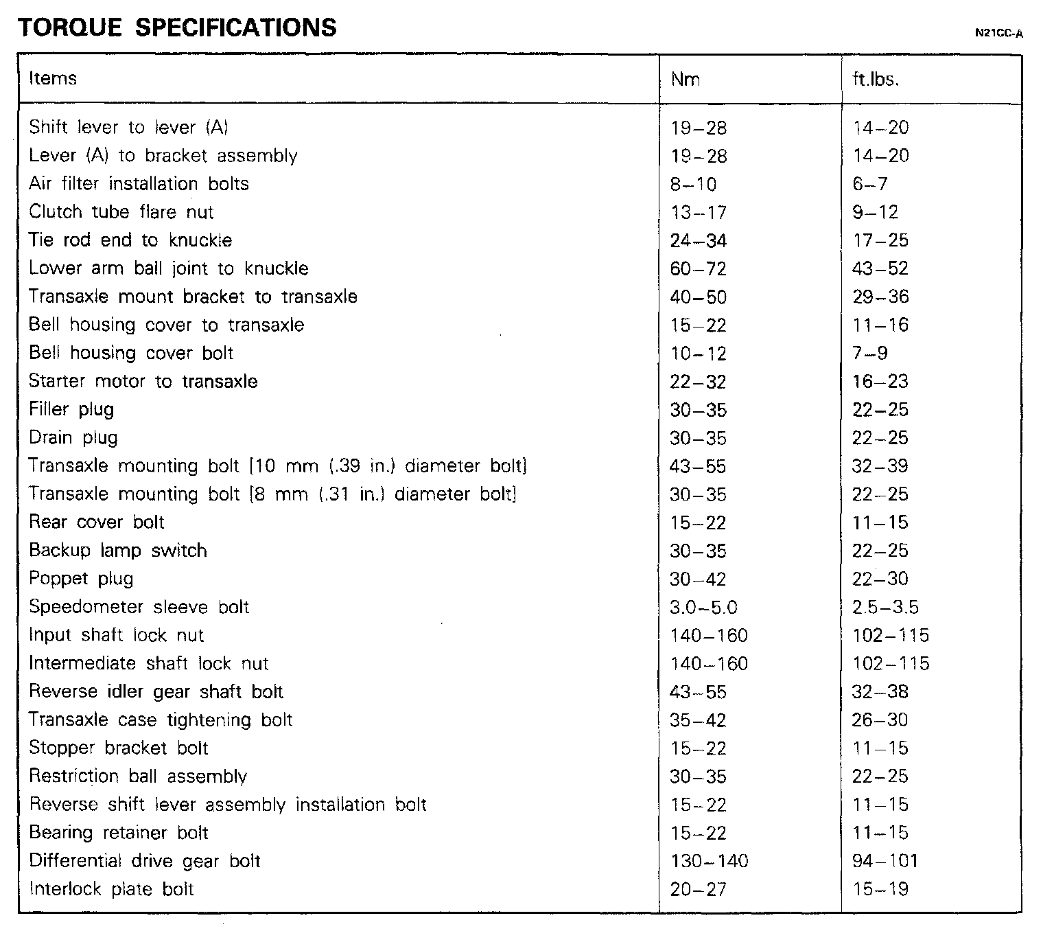 KM210A 5-spd M/T, Transaxle Torque: