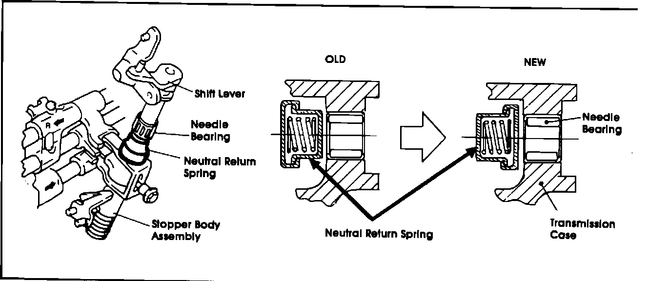 2. Neutral Return Spring Modification The installation direction of the neutral return spring has been changed to improve serviceability. The large diameter end of the spring should now face the clutch housing (needle bearing) instead of the interlock plate (Figure 2). The new installation direction was added to vehicles beginning with the following date and transaxle number: