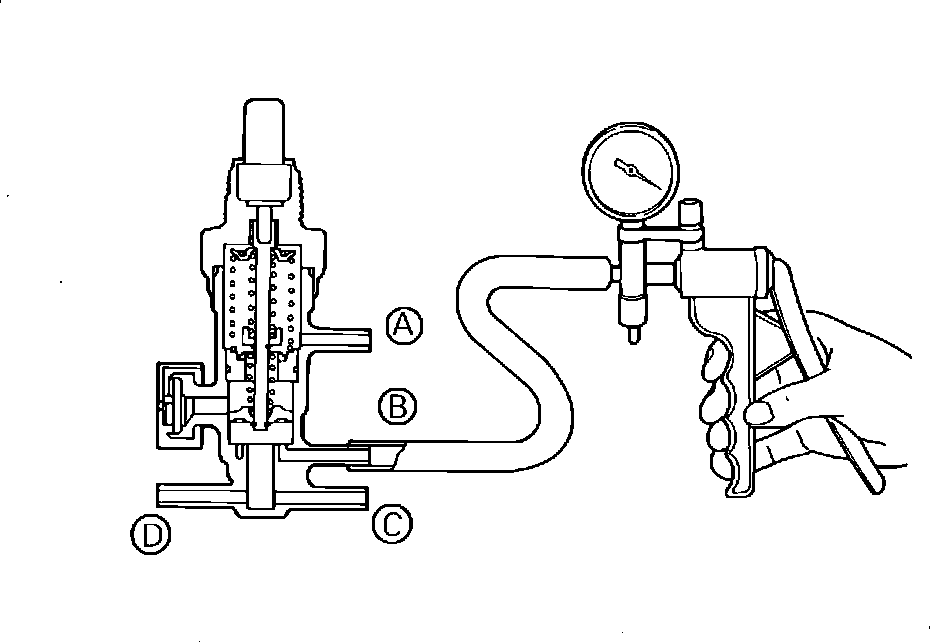 4. Connect a hand vacuum pump to nipples (B), (C), and (D), Fig. 120. Apply vacuum and verify that when engine coolant temperature is less than 40 degrees C (104 degrees F) vacuum leaks and when engine coolant temperature is greater than 80 degrees C (176 degrees F) vacuum holds.