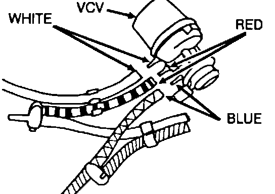 1. Obtain the vacuum hose assembly and the Vacuum Control Valve (VCV) from the Emissions kit. Connect the blue striped vacuum hose to the blue Vacuum Control Valve nipple. Connect the red striped and long white striped vacuum hoses to the nipples with corresponding red and white dots on the VCV (Figure 3).