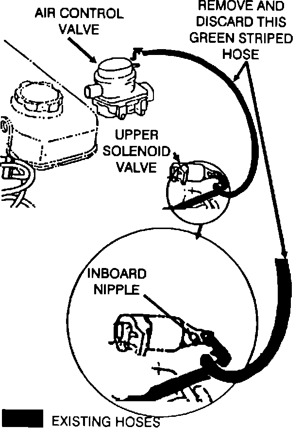 3. Remove and discard the green-striped hose that connects the Air Control Valve and the inboard nipple of the upper solenoid valve (Figure 5).