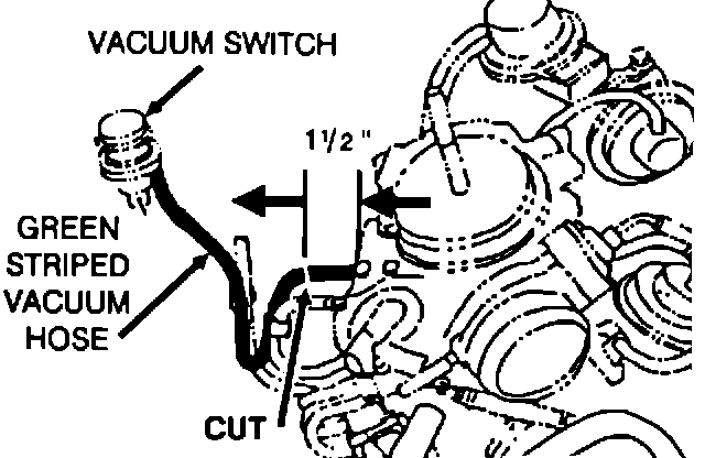 13. Cut the existing green striped vacuum hose leading from the vacuum switch to the carburetor about 1-1/2" from the carburetor (Figure 15).
