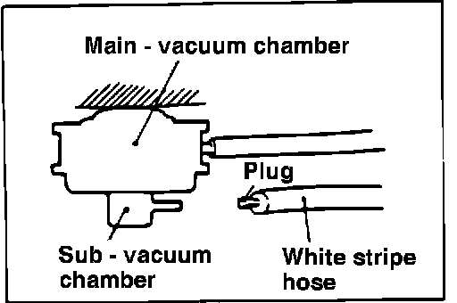 3. When checking the basic ignition timing at high altitude [altitude of 1200 m (3900 ft.) or more], disconnect the vacuum how (white stripe) from the sub-vacuum chamber of the distributor and plug the hose end. Cars for 50 states and high altitude cars for 49 states excluding California