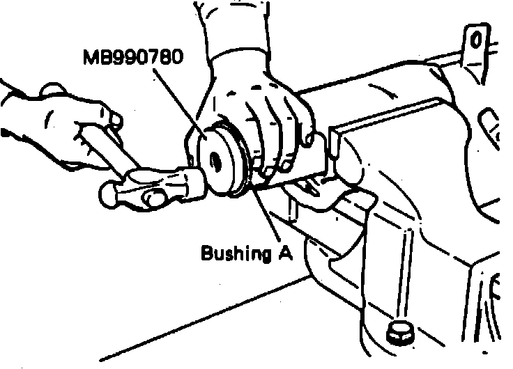 5. Using tool MB990780 or equivalent, install bushing ``A'' on left suspension arm, Fig. 22.