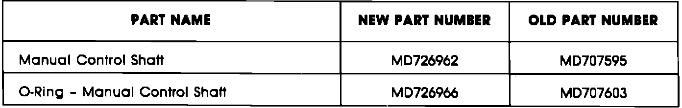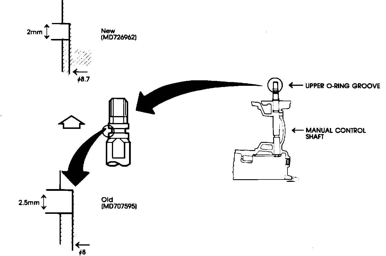 To improve shift feeling of the KM170-series automatic transmission in 1987 Galant, Mirage and Cordia/Tredia vehicles, the manual control shaft has been modified (Figure 1).