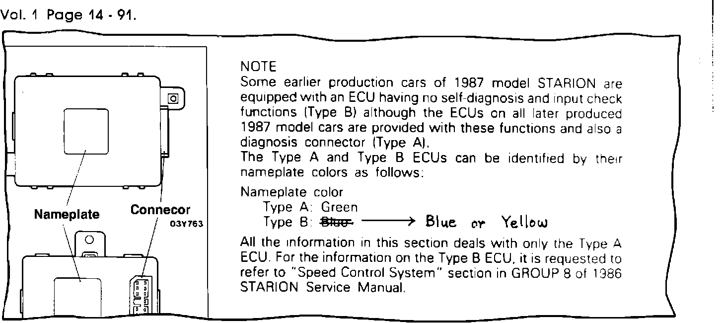 This bulletin corrects the nameplate color for the Electronic Control Unit (ECU) in the Automatic Speed Control System description in the 1987 Starion Service Manual. As reference to this bulletin, please write the STB number in the revision box on Page 14-91 of Volume 1, 1987 Starion Service Manual.