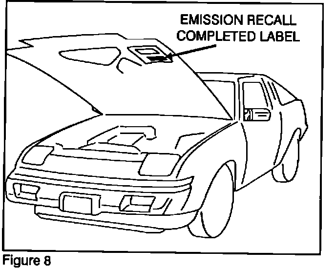 3. Carefully remove all dirt and oil from the vacant area BELOW the existing Vehicle Emission Control Information (VECI) label. Affix the Emission Recall Completed Label BELOW the existing (VECI) label (Figure 8).