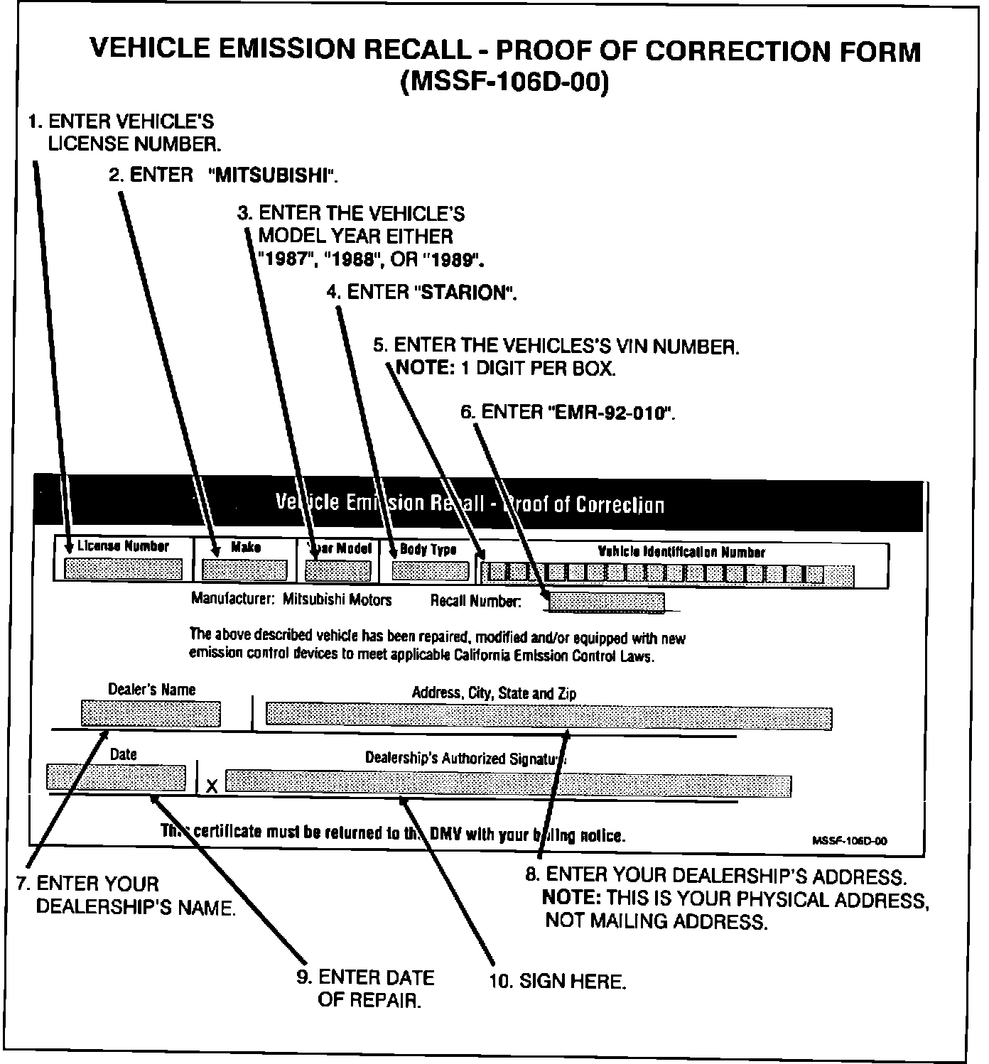 California residents who own an affected vehicle, may be required to send in a Vehicle Emission Recall - Proof of Correction form (MSSF-106D-00) to the California Department of Motor Vehicles (DMV) as evidence of recall completion when they apply for vehicle registration renewal. Each customer whose vehicle is registered within California must be given a completed Vehicle Emission Recall - Proof of Correction form after the recall has been completed. Packages of this form have been sent to California dealers along with this bulletin. Additional forms are available from your facing PDC in packages of 25.