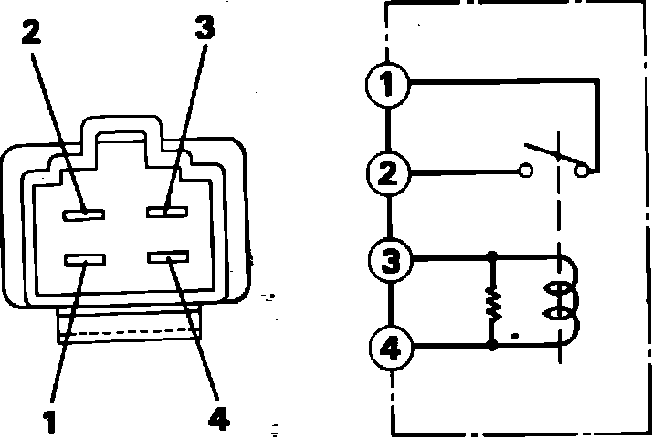 Check for continuity between fan motor relay terminals. With no battery voltage applied to relay, continuity should be present between terminals 3 and 4, Fig. 4. With battery voltage applied to terminals 3 (positive) and 4 (negative), continuity should be present between terminals 1 and 2, Fig. 4.