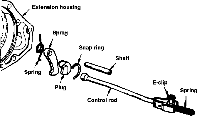 5. Remove extension housing to transmission bolts. In the following step, the gearshift must be in low therefore positioning the parking lock control rod rearward so it can be disengaged or engaged with parking lock sprag.