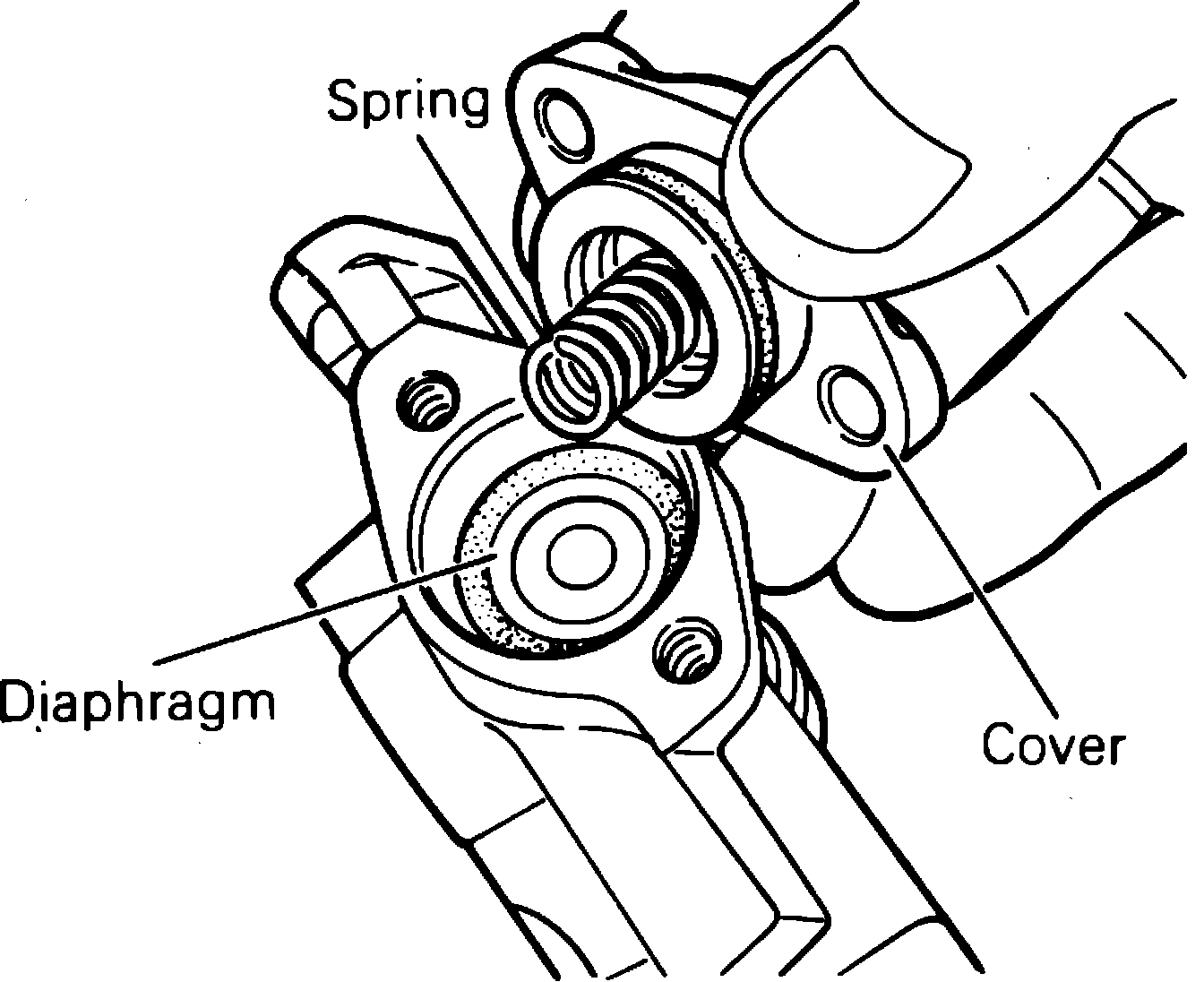 4. Remove fuel pressure regulator and pulsation damper cover from retainer, then the spring and diaphragm, Fig. 50.