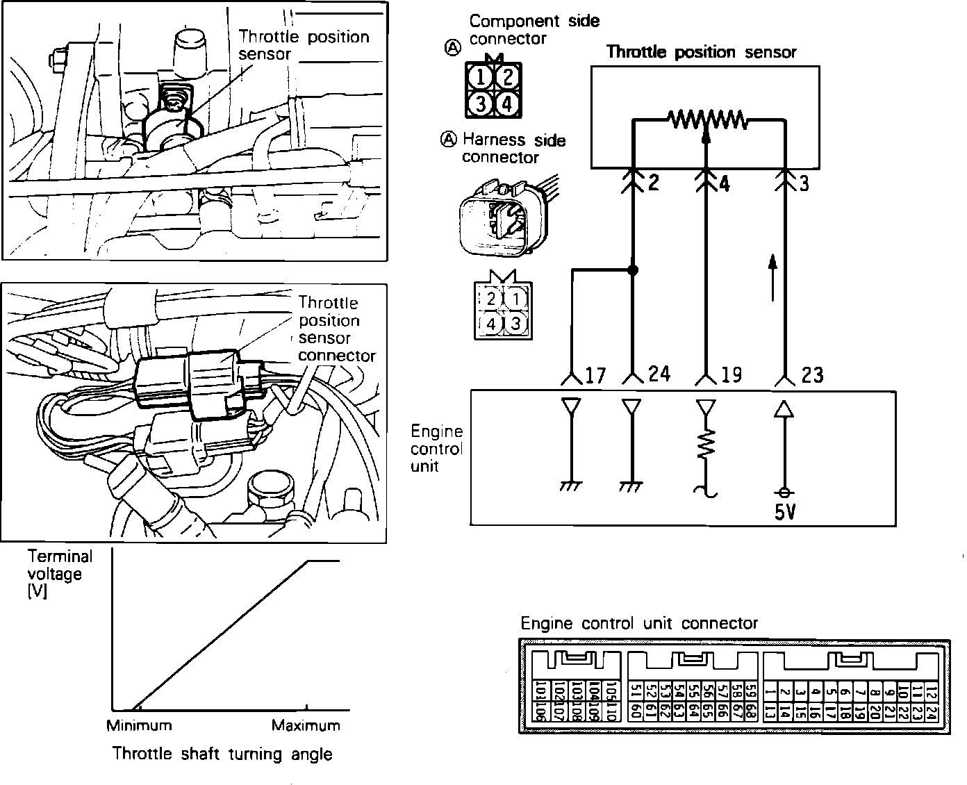 2. Using a high-impedence digital voltmeter, carefully back probe the throttle position connector into terminals #2 and #4. Refer to the connector in the image.