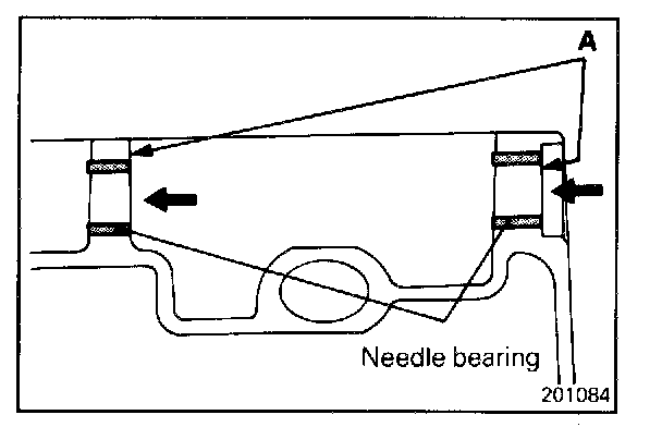 1. Using a socket wrench, press-fit the needle bearing flush with surface A in the clutch housing.