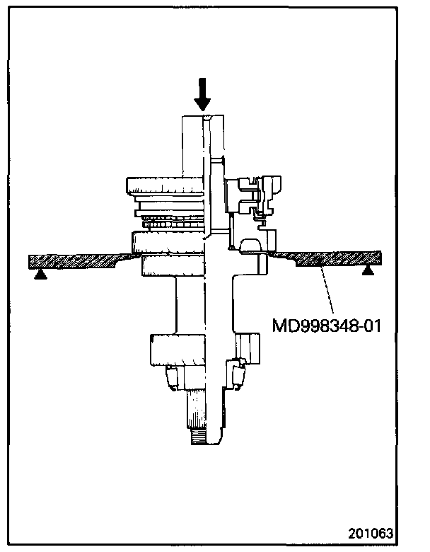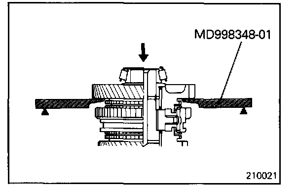 Using the special tool, press-fit the 1st speed gear and bearing sleeve.