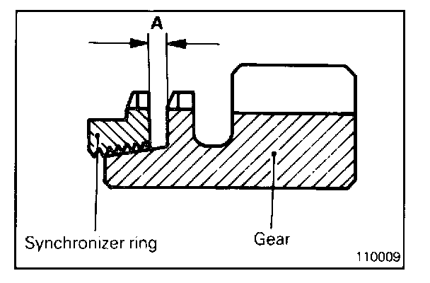 - Force the synchronizer ring toward the clutch gear and check clearance "A". Replace if the measurement is below the limit.