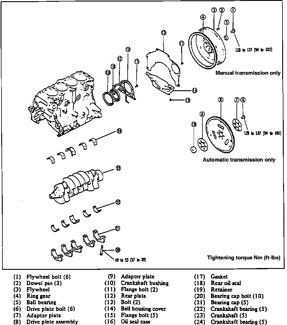 10. On automatic transmission models, install adapter plates and driveplate, then tighten bolts to specification.
