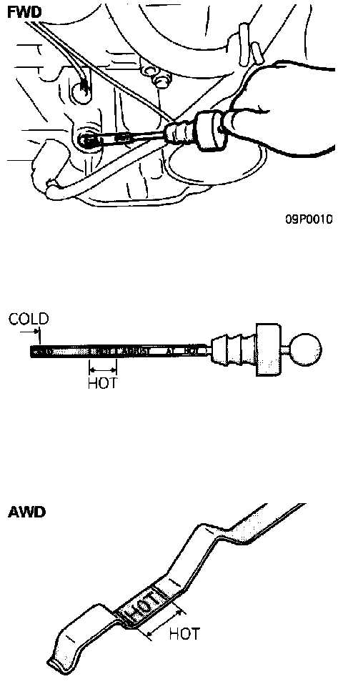 4. Before removing dipstick, wipe all dirt from area around dipstick. Then take out the dipstick and check the condition of the fluid. The transaxle should be overhauled under the following conditions:
