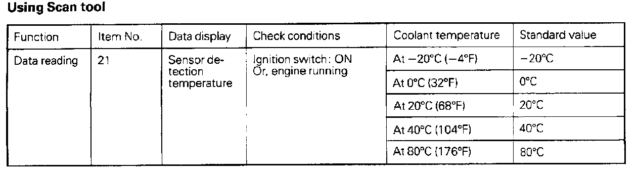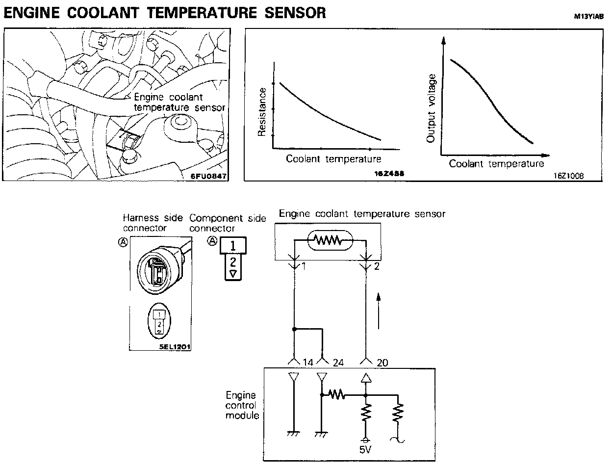 Note that the resistance of the engine coolant temperature sensor decreases when the temperature of the coolant increases.