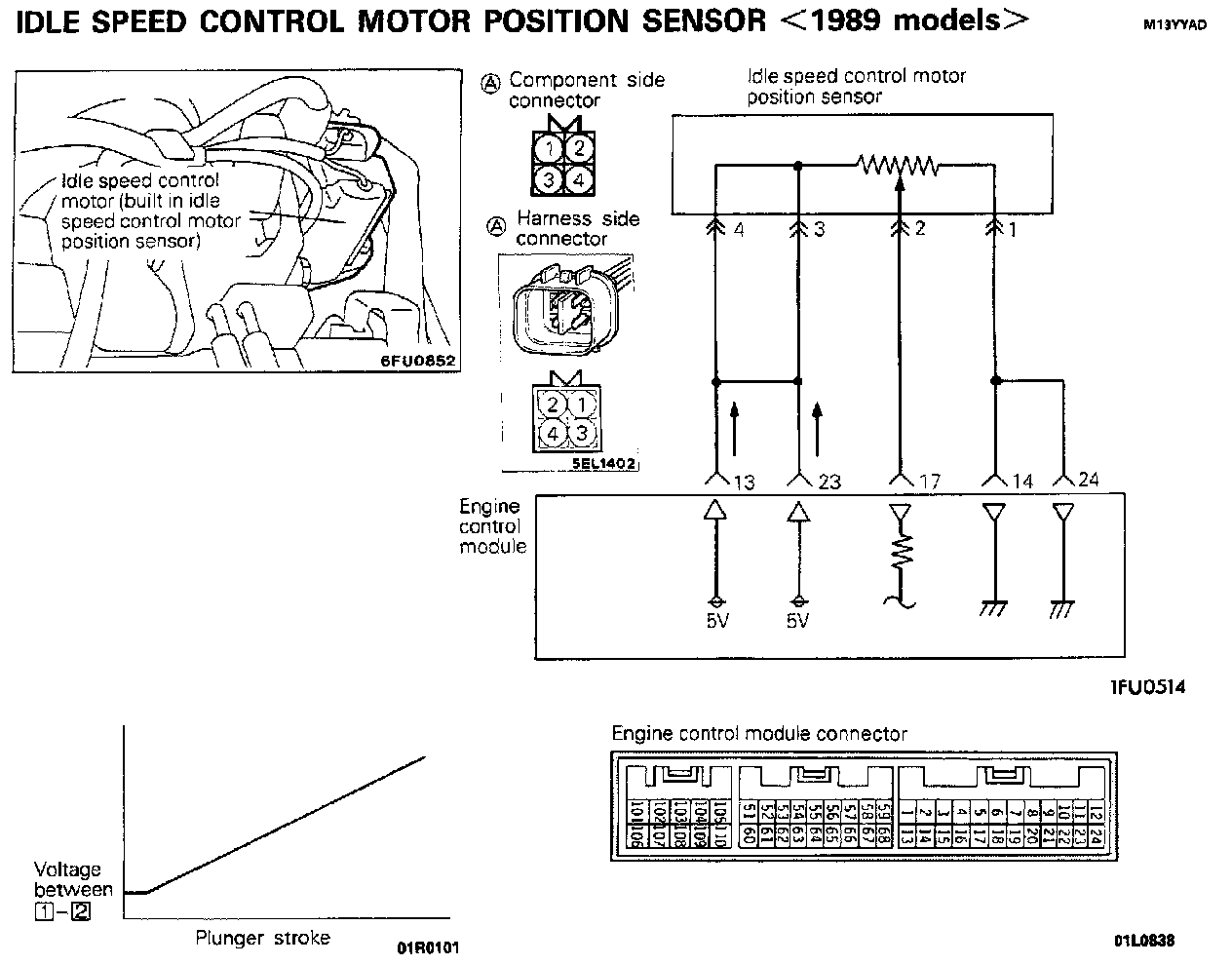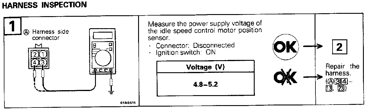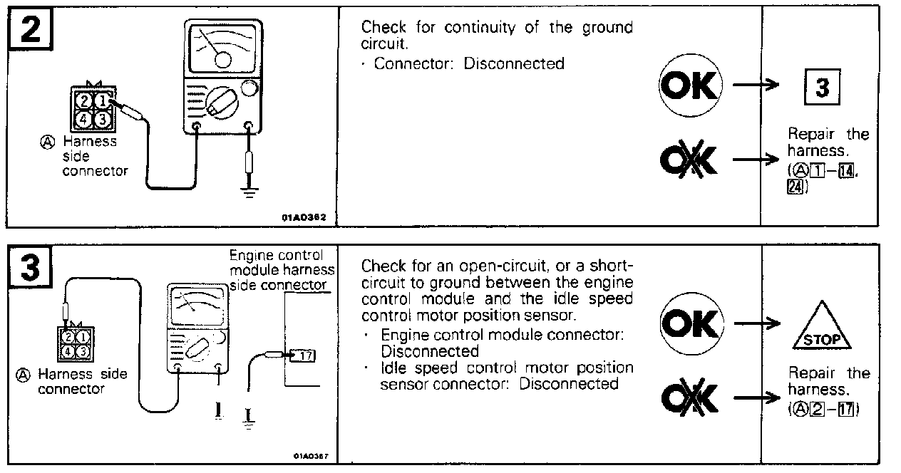 If the output voltage of the idle speed control motor position sensor deviates from the standard value even though the results of the checking of the idle speed control motor position sensor harness and of the component itself are normal, the malfunction may be presumed to be among the following: