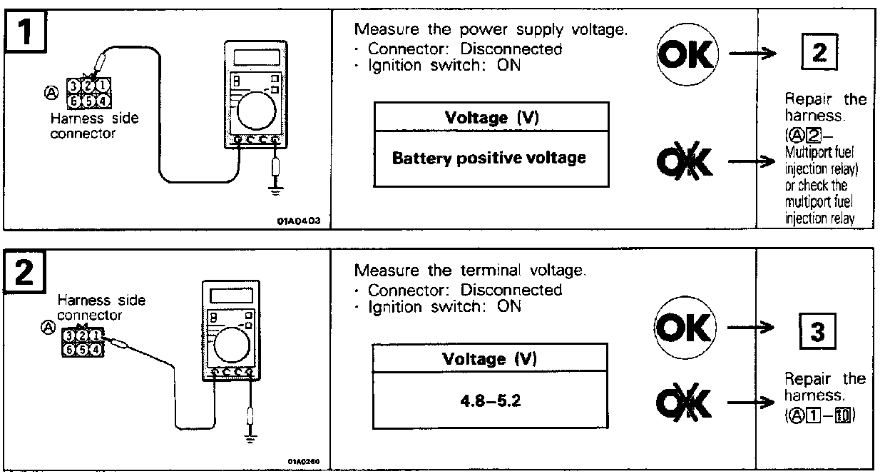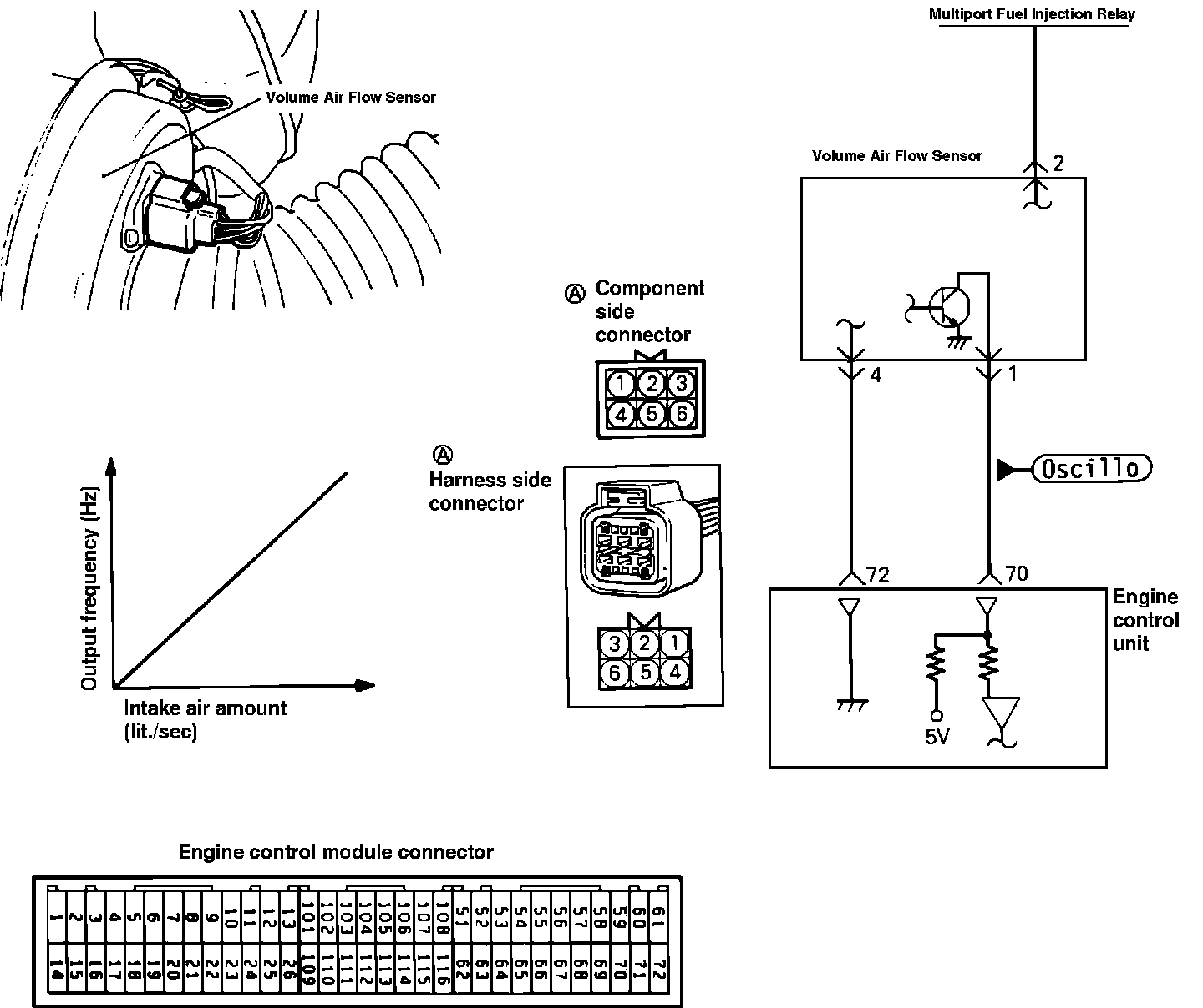 The power for the volume air flow sensor is supplied from the multiport fuel injection reiay to the volume air flow sensor, and is grounded at the engine control module. The volume air flow sensor, by intermitting the flow of the 5V voltage applied from the engine control modLIe, produces pulse signals.