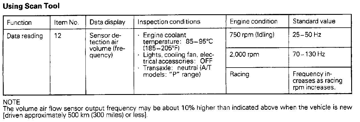 3. If idling is possible even though the volume airflow sensor output frequency is deviated from the standard value--the cause is usually a malfunction other than the volume airflow sensor.